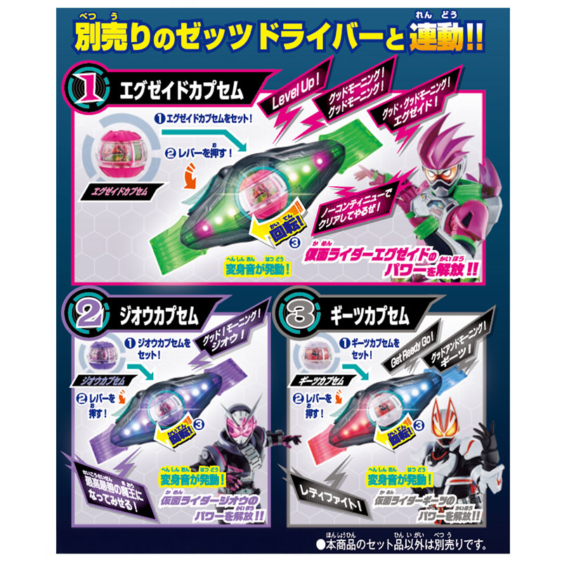 別売りの「変身ベルト DXゼッツドライバー」に対応するレジェンドライダーカプセム3種のセット商品です。 ゼッツドライバーと連動させることでそれぞれのカプセムに応じたLEDの発光演出が発動し、オリジナル音声遊びが楽しめます。