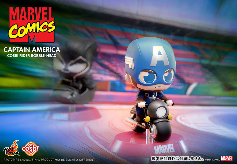 バイクに乗ったキャプテン・アメリカを、全高約10cmのミニフィギュアで立体化。ヘッドはプルプル揺れる姿がユニークな、ボブルヘッド仕様。日本で企画されたオリジナルのパッケージは、そのまま飾っても可愛いウィンドウボックスとなっているぞ。