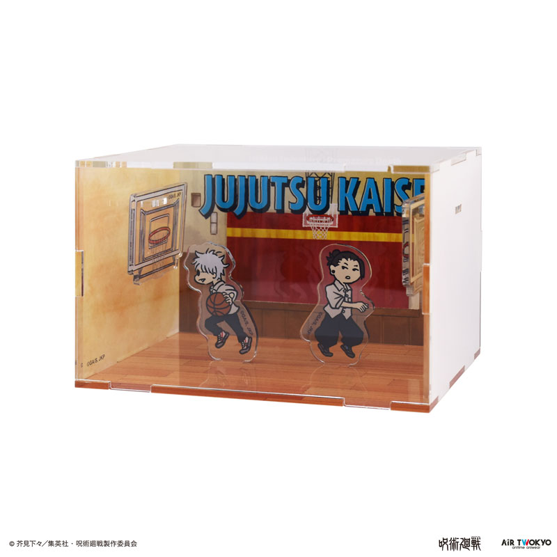 体育館で五条悟が夏油傑からバスケットボール取ったシーンを再現したアクリルジオラマが登場! 二人のかわいらしいデザインがお部屋を彩ります。