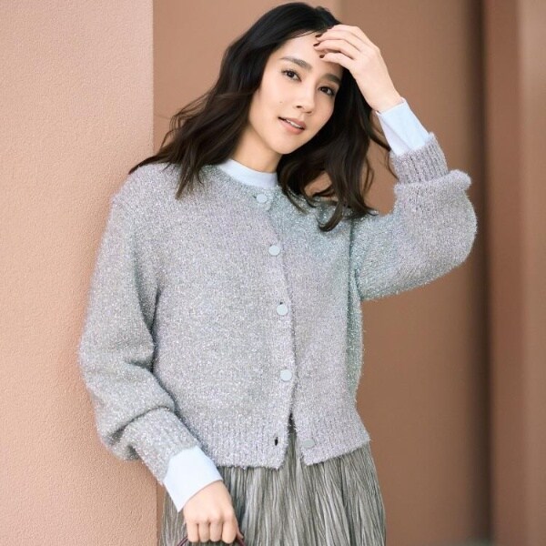 軽やかさとふくらみのあるファンシーヤーンを使用したメタリックなラメの光沢感を持つ華やかなカーディガン。