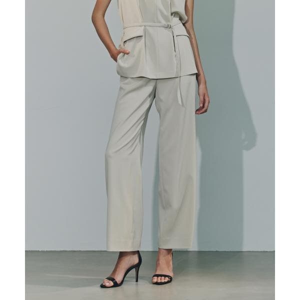 美しい表面感とドレープ性が魅力の薄手合繊素材を使用したパンツ。程よい太さのセミワイドシルエットが、動きに合わせて美しいドレープを生み出します。ハイウエストデザインでスタイルアップ効果もあり、肌離れも良く軽やかな履き心地を実現。同素材のブラウスと合わせたセットアップスタイルは、洗練された印象を引き立てるお勧めのコーディネートです。