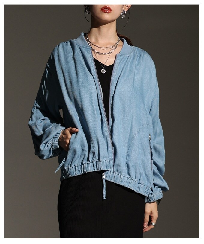 柔らかなデニム素材で、軽やかに着こなせるブルゾン。程よくルーズなシルエットで体型を拾わず、さらっと羽織るだけでこなれた雰囲気に。裾と袖口はゴム仕様で、ふんわり感をキープしつつ動きやすさも◎デニム特有の重さを感じない軽やかさで、春先や秋口のアウターにぴったり。