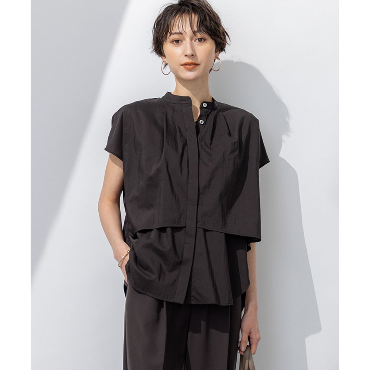 レイヤードデザインの華やかなブラウスです。バックスタイルにもフレア仕様が続いており、360°何処から見ても美しいシルエットで、華やかな印象を与えてくれます。袖は二の腕をキレイに魅せてくれる丈感になっています。パンツと合わせたスタイリッシュな着こなしがおすすめです。カラーは爽やかな印象のホワイト(#001)、抜け感のあるダークブラウン(#035)、モードな雰囲気のブラック(#005)、差し色にもおすすめなラベンダー(083)4色展開です。