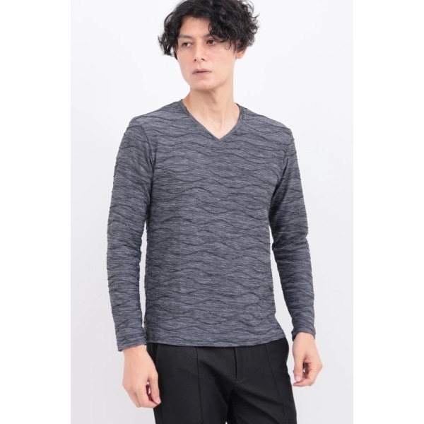 まるで波のような独特の凹凸感を持つ「ウェーブストームタック天竺」を使用しました。繊細なボーダーと染め分けられたニュアンスカラーが織りなすアンニュイな雰囲気が、シンプルながらも着るだけでモードな印象を演出します。