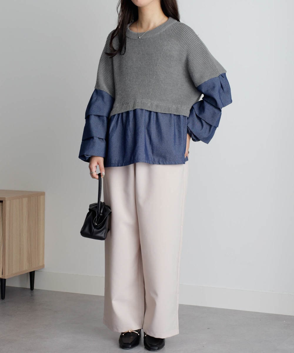 カジュアルなデニム素材にざっくりニットで抜け感を。ドッキングデザインで1枚で着映えます。【商品】