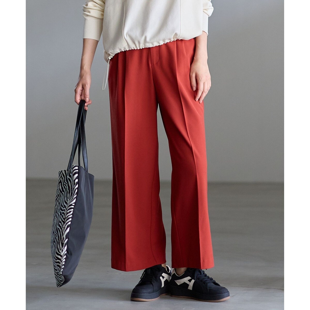・2タックの立体的なシルエットが美しいワイドパンツ・ウエスト周りはすっきりと、後ろ中心にゴムを入れギャザー分量を調整しすっきりと穿き着心地のいい仕様に・きちんと感もこなれ感も演出できる毎日穿きたくなる1本・ファスナー開き+前カンで着脱しやすい・センタープレスはリントラク加工を施したプレスがとれにくい仕様