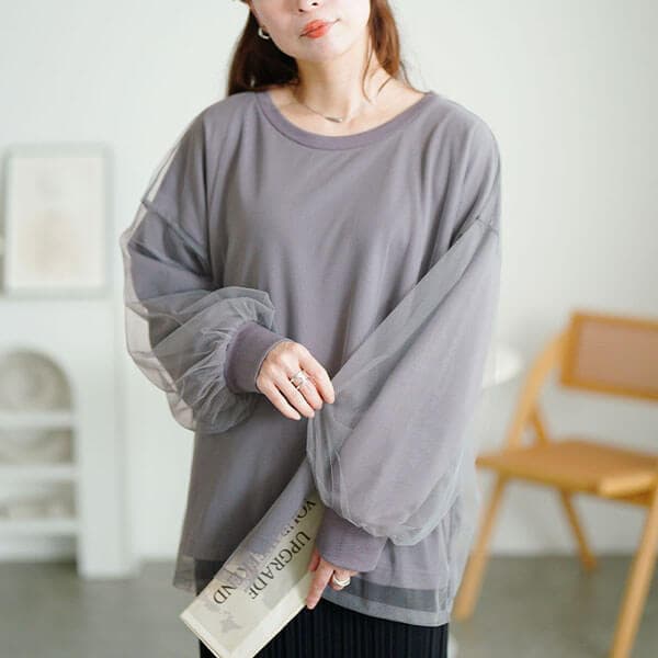レディな気分高まる異素材使いのチュールレイヤードボリューム袖トレーナーの登場です♪体型を拾わないゆとりのある身幅でストレスフリーな着心地◎ぽっちゃりさんの気になるお腹&ヒップが隠れる長め着丈で体型カバー力も抜群☆たっぷりボリュームのチュールぽわん袖がカジュアルスタイルに女性らしい華やかさをプラス♪シンプルなデザインなのでどんなスタイルにも馴染み着まわし力抜群です◎