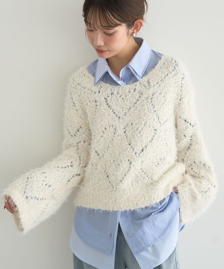 ふんわり毛足の暖かみあるニットで仕立てたプルオーバートップ。ポコポコと凹凸感のある糸で編み仕立てたナチュラルな優しい雰囲気が魅力的です。透かし編みのデザインにはさり気なくハートモチーフを表現。首元すっきりのUネックに落ち感あるシルエットがフェミニンに演出してくれる、デイリーカジュアルにもおすすめのアイテムです。透け感[ややあり]