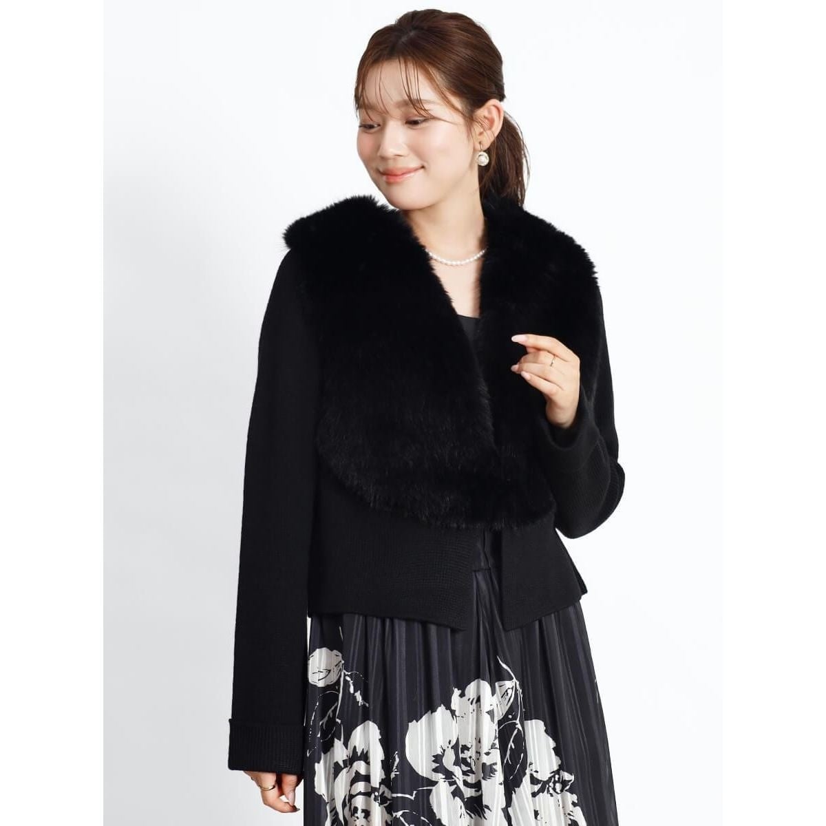 リュクスなファーが華やかさと季節感を高めるニットカーディガン。