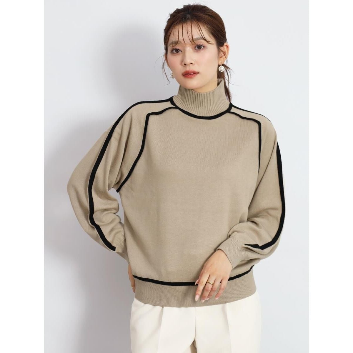 配色ラインがスタイリングにアクセントを加えるハイネックニット。