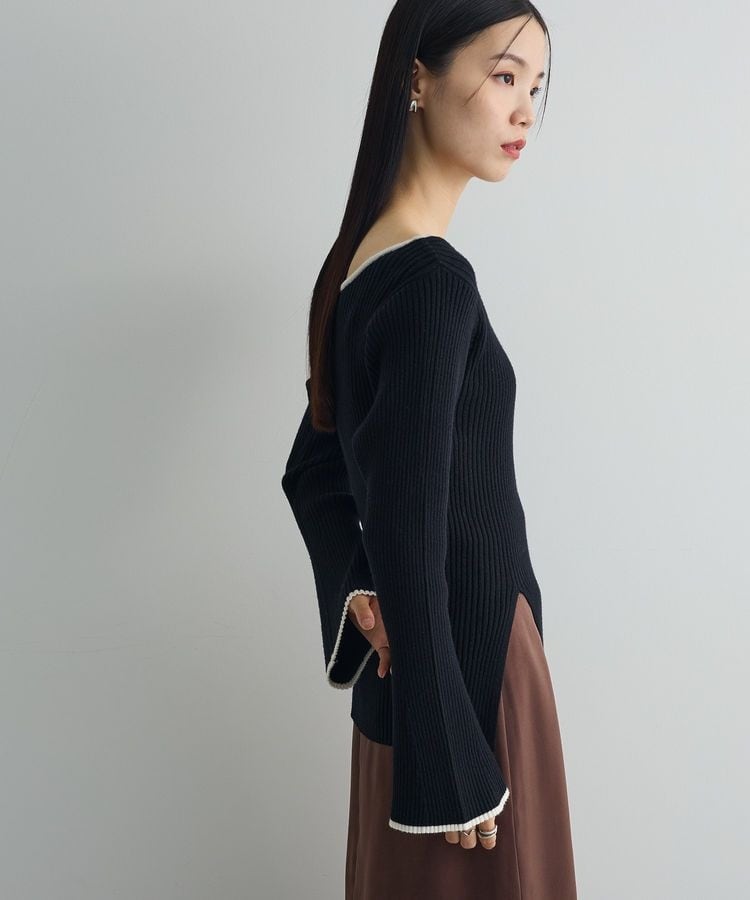 上品さとヘルシーさを兼ね揃えたリブニットトップス。前後で首回りのデザインを変えた2WAYでお楽しみいただける1着です。身体に優しくフィットするシルエットに、女性らしいフレアスリーブも魅力のポイント。シンプルなボトムスとの相性も抜群で、1枚持っているだけでコーディネートの幅がグッと広がるトレンドアイテムです。透け感[なし]