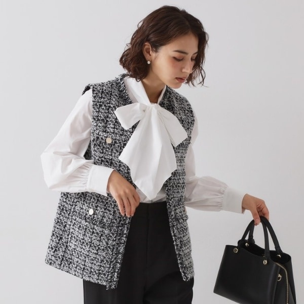 ・トレンド感のあるブークレ糸を使用した立体感のあるツイード素材で、通勤やデニムなどを合わせたきれいめカジュアルスタイルにもおすすめ。