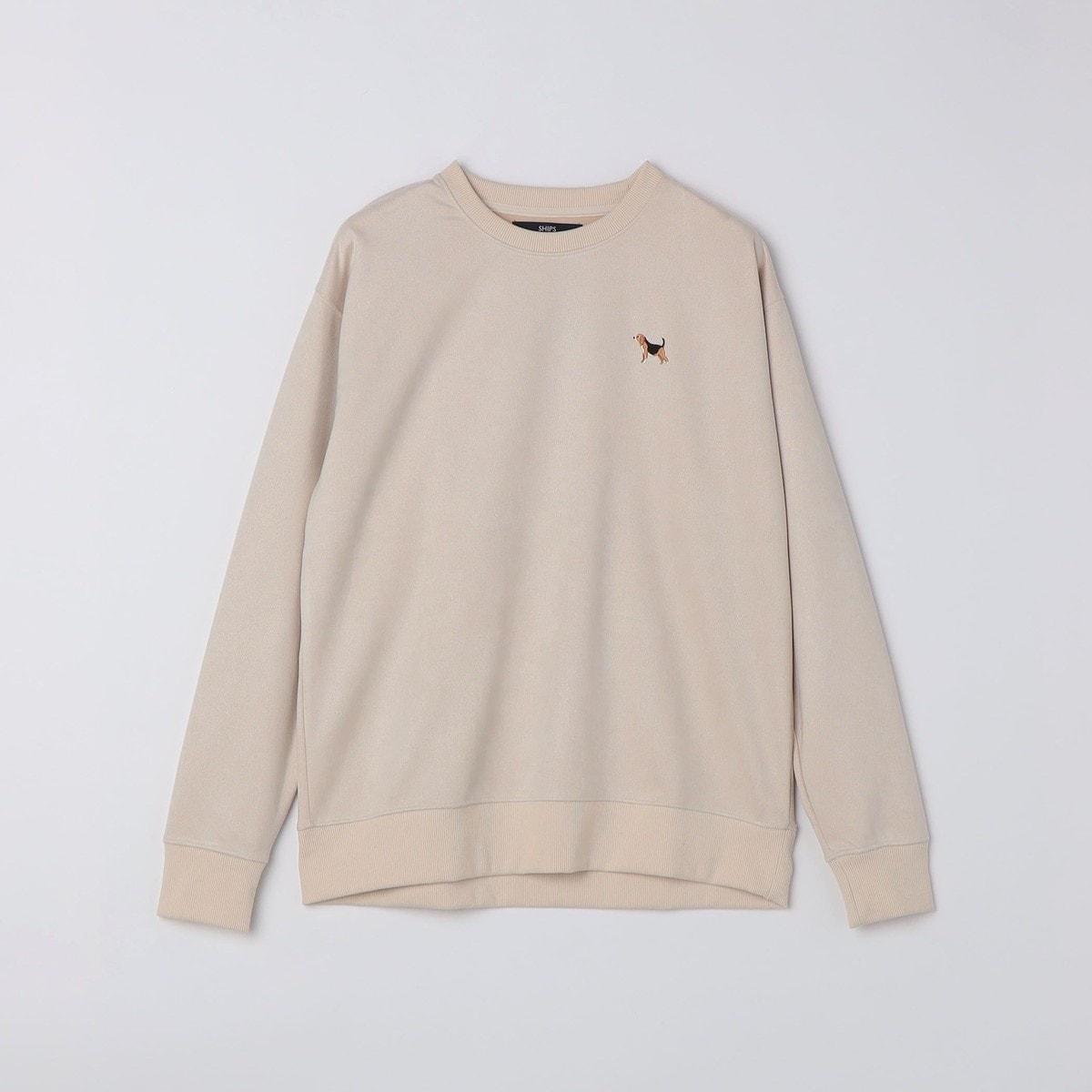 左胸にアニマル柄を刺繍した、合繊素材のフェイクスエードスウェット。