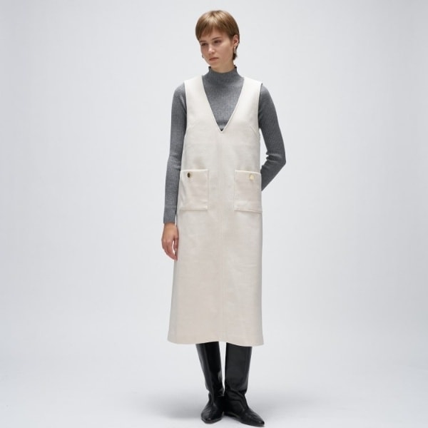 ・タートルネックやリブトップスと重ねるだけで、季節感のあるコーディネートに。