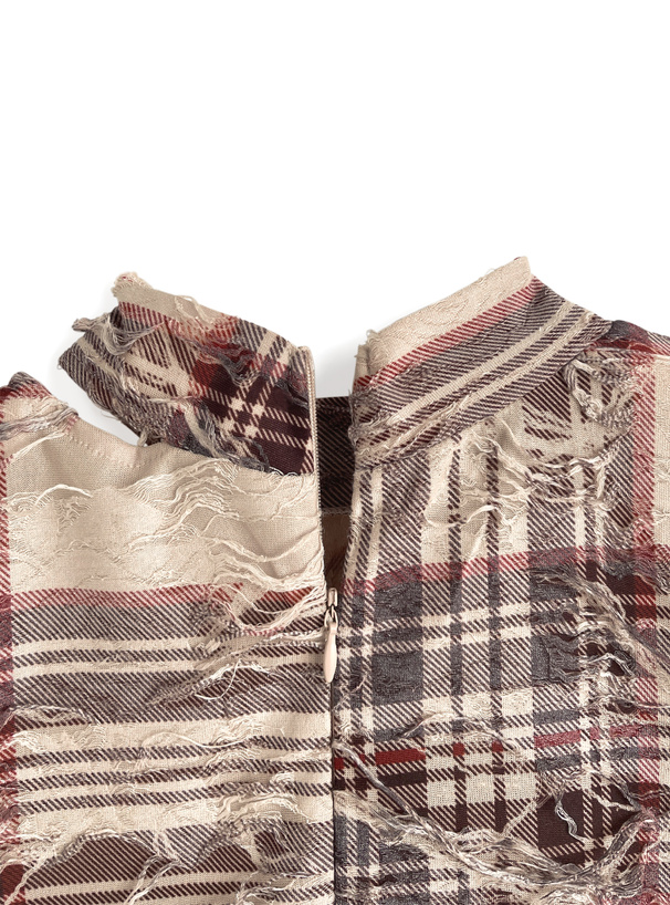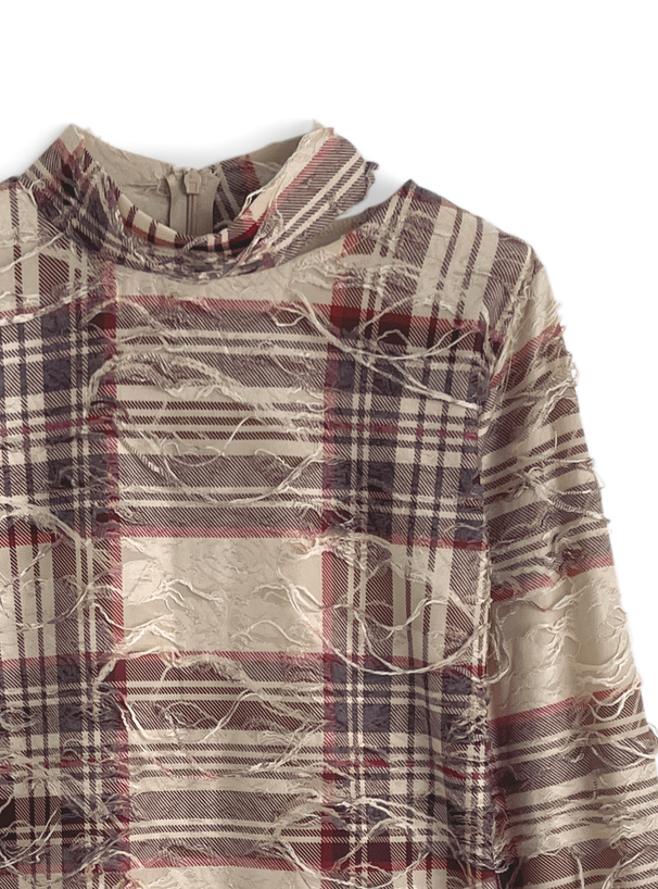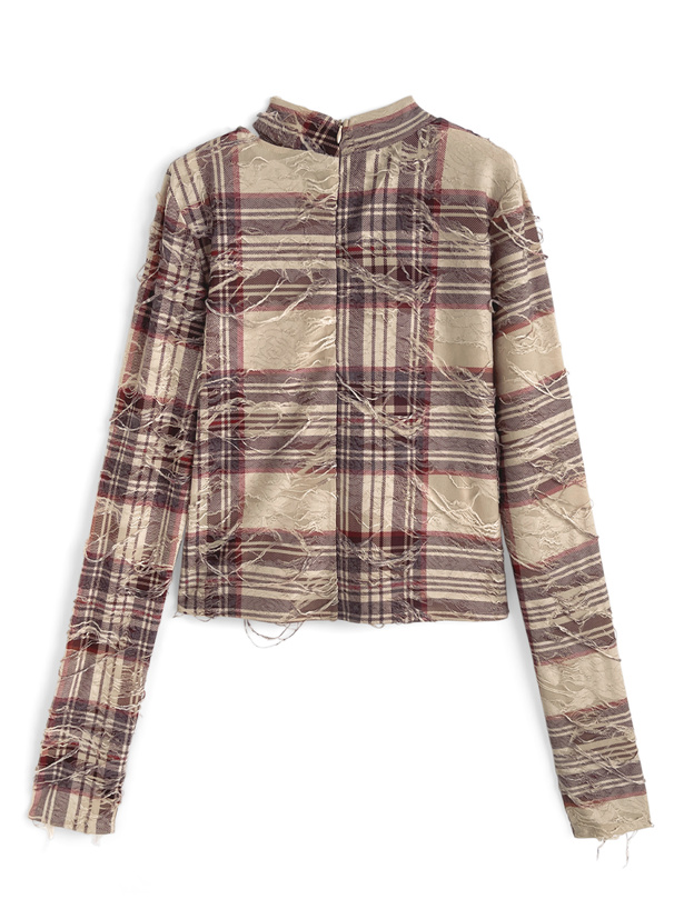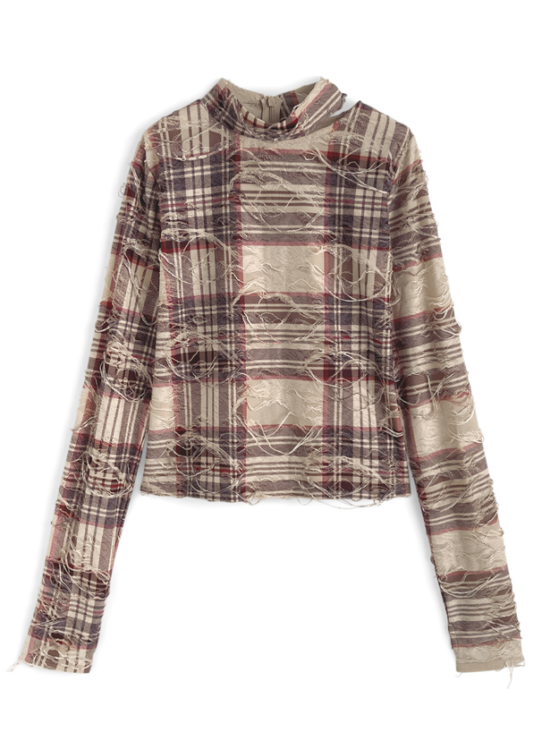 軽やかなシアー生地にチェック生地を重ね、大胆なダメージ加工を施したトップス。