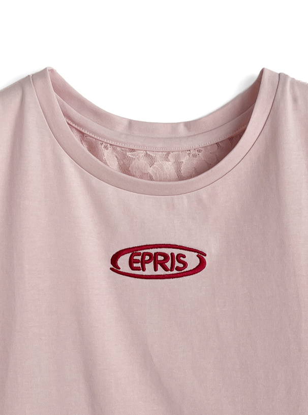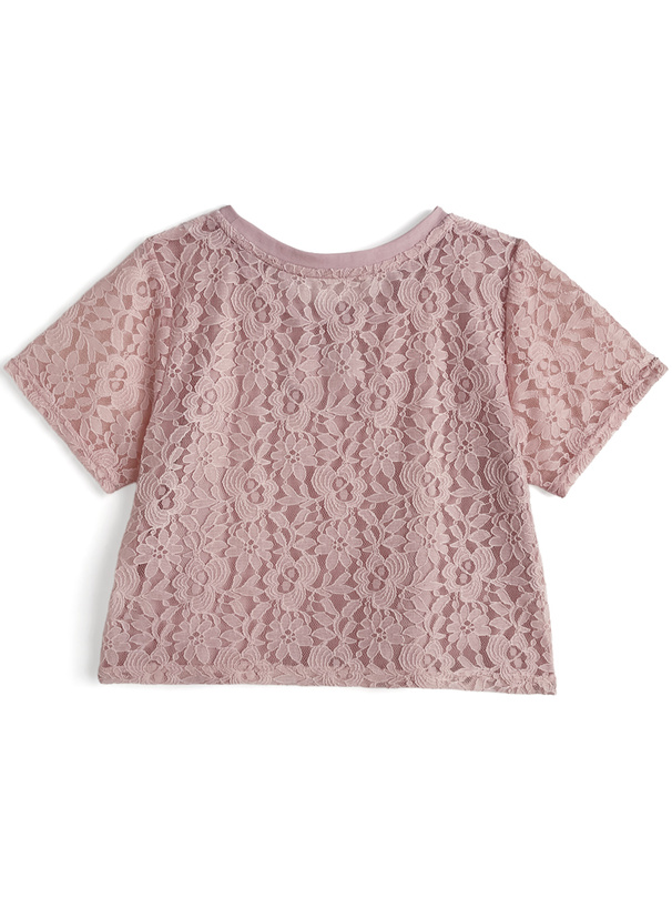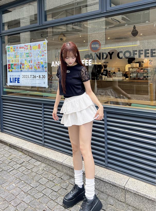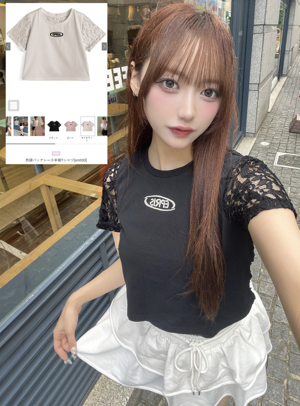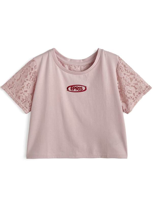 袖や背中部分を大胆なレース仕様にすることで甘めに仕上げたTシャツ。