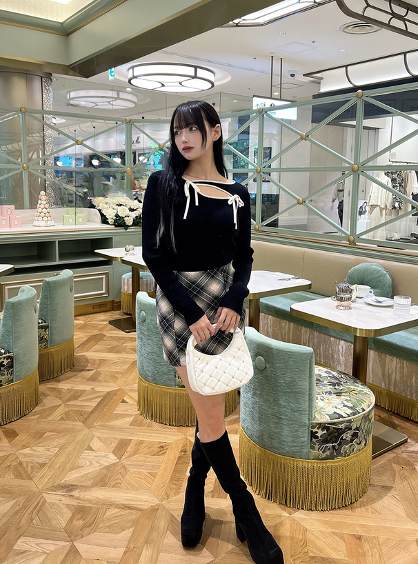 バストラインに施したカットアウトと2つのリボンが視線を引き寄せるポイント。