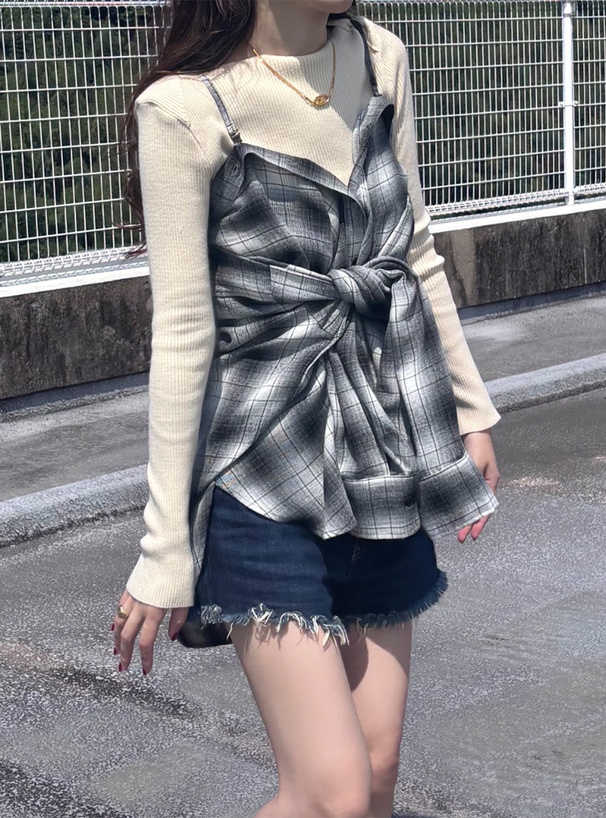 内側にストラップが付いているのでオフショルにでき、さらに袖をウエストに巻き付けることでキャミチュニックにもアレンジが可能。