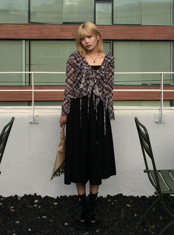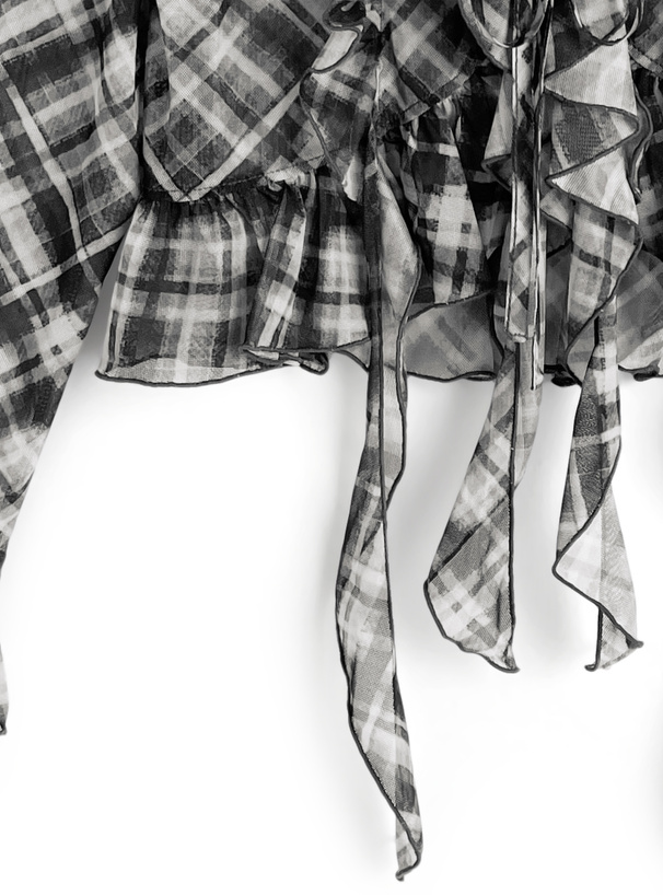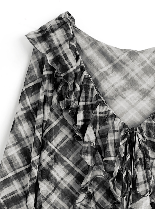 メロウで縁取った流れるようなカスケードフリルが、シルエットに動きをつける。