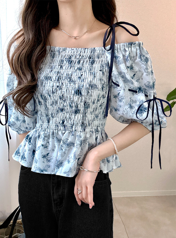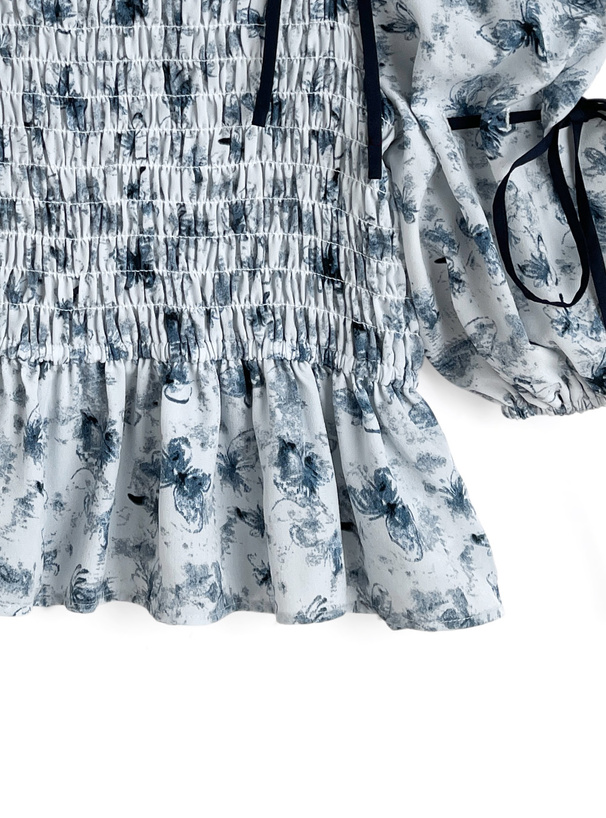 水彩タッチのフラワー柄が清楚な女性を演出するブラウス。