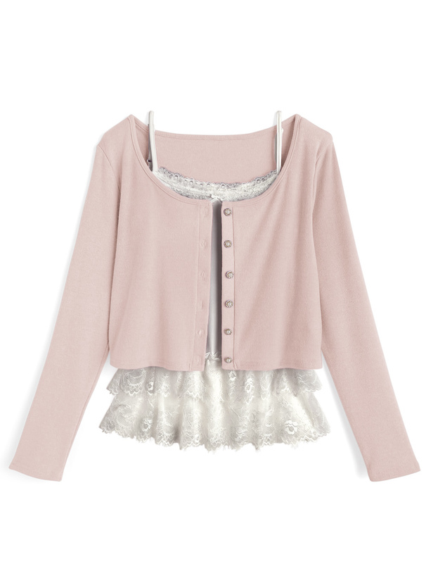 レースとリボンをあしらったキャミソールとカーディガンのアンサンブル。
