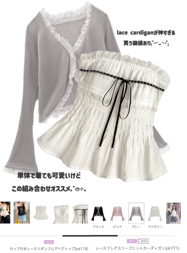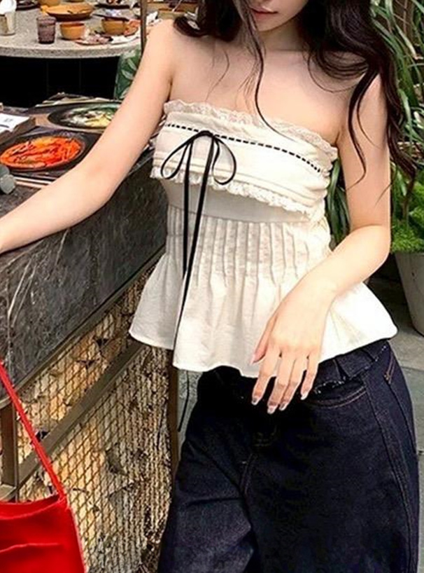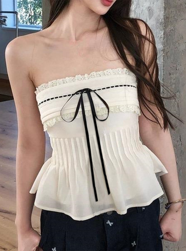 レースやピンタック、リボンディテールが贅沢にあしらわれたベアトップ。