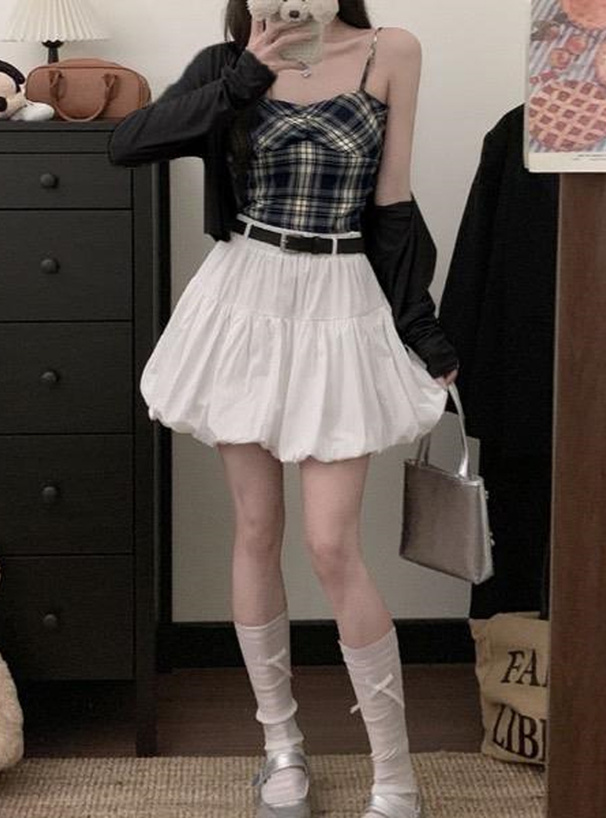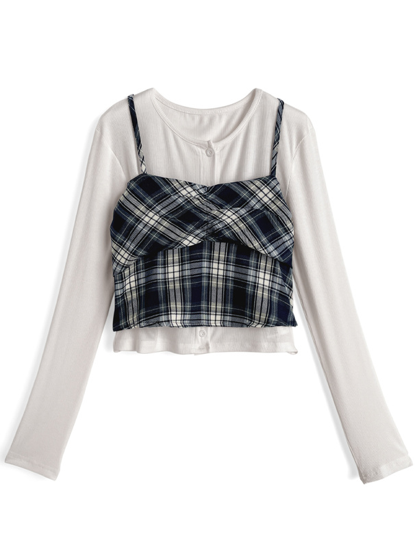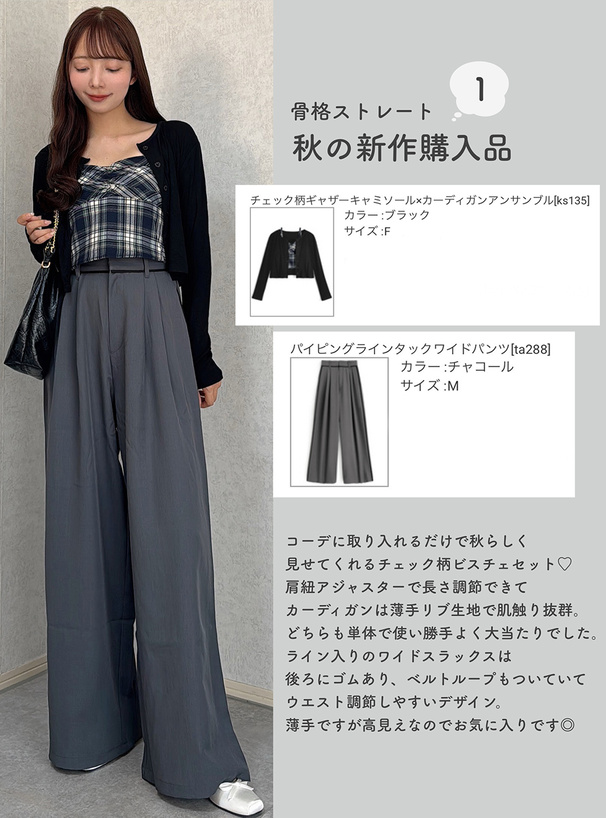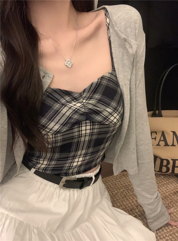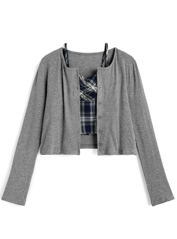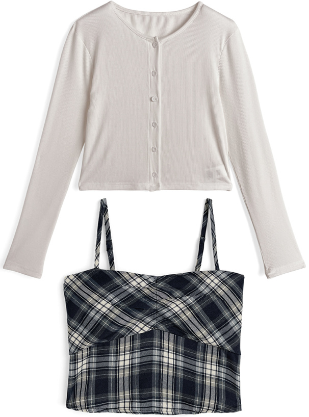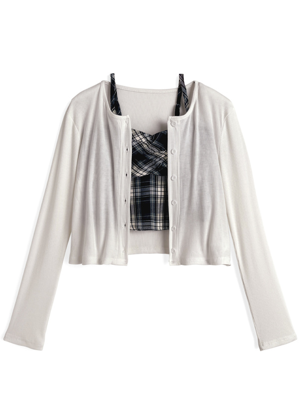 ベーシックなリブカーディガンと、チェック柄キャミソールのセットアップ。