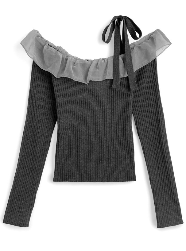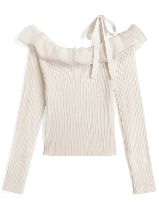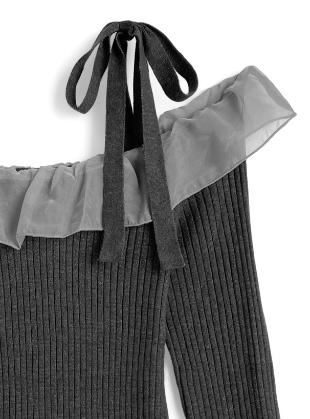 片方の肩にあしらったリボンも甘さを添えるデザインポイント。