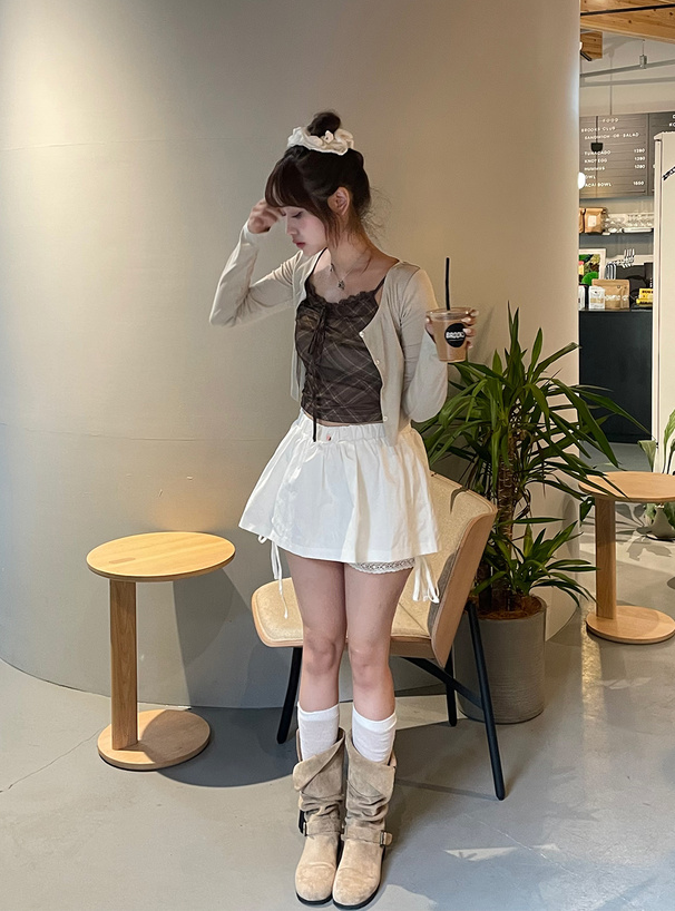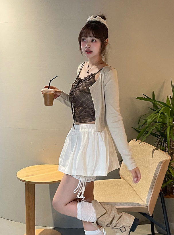 ベーシックなカーディガンとチェック柄のキャミソールがセットになったアンサンブル。