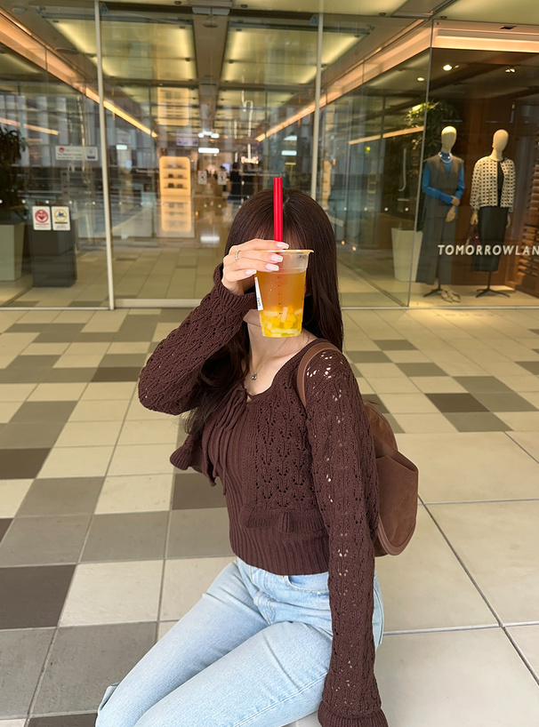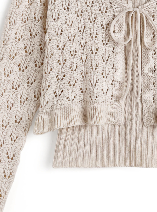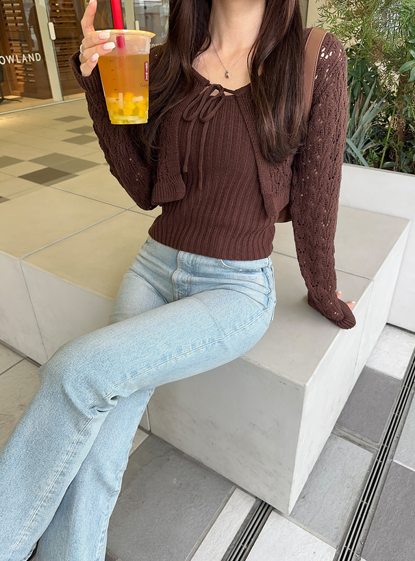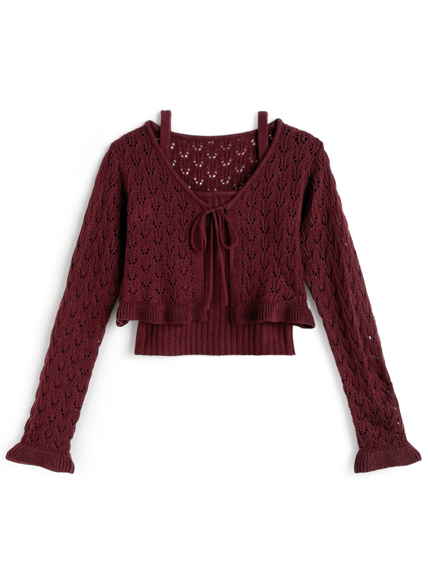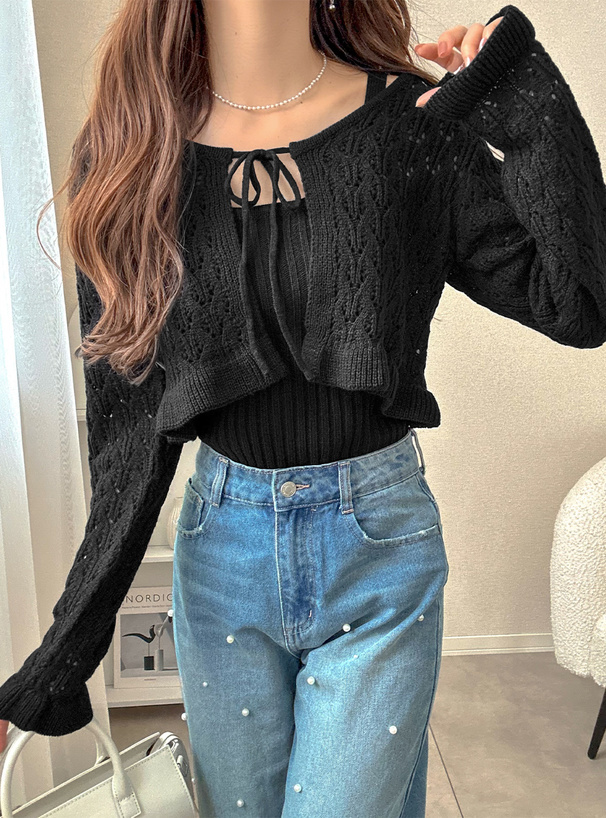緩めの透かし編みが施されたニットカーディガンとリブ編みキャミソールのセット。