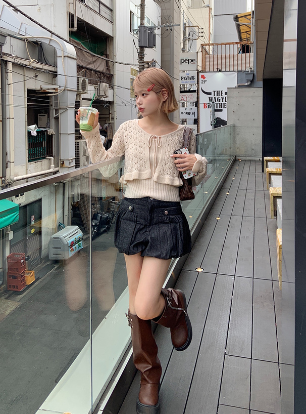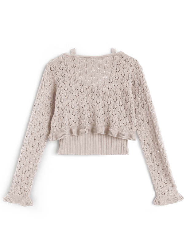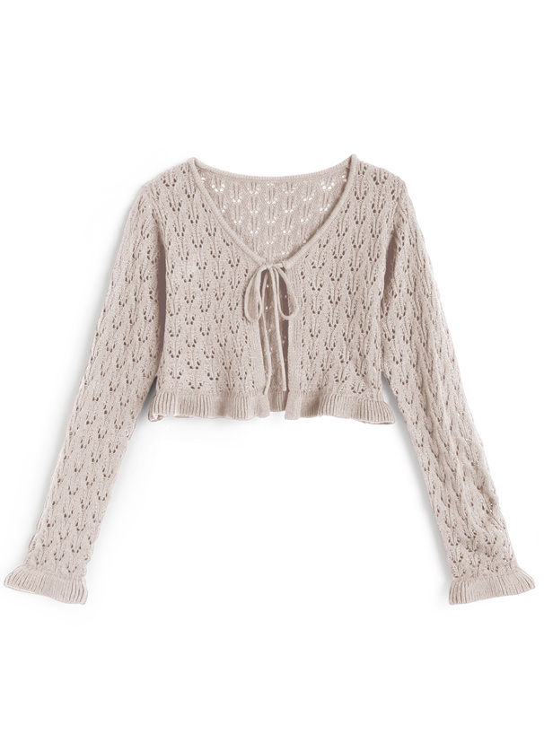軽やかな雰囲気のカーデは、袖口や裾のフリルがフェミニンなイメージをプラス。