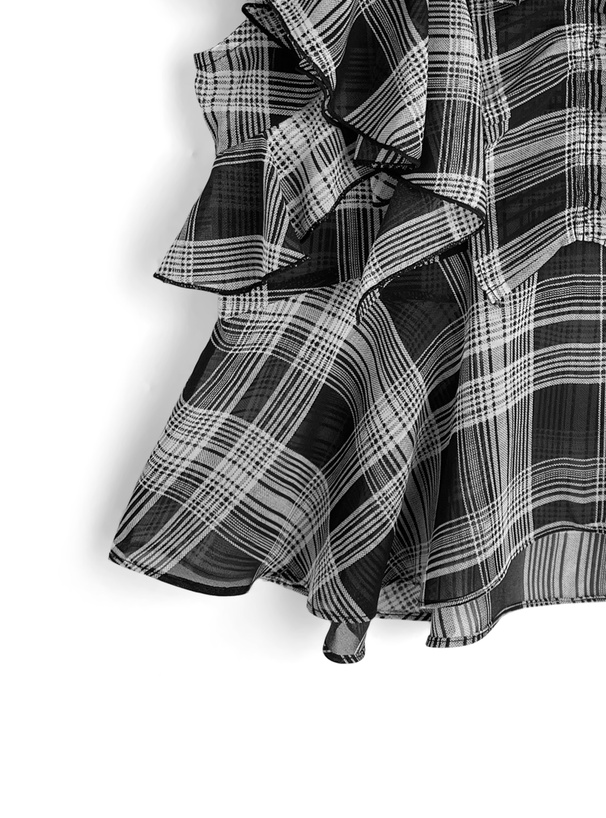 斜めに重ねた大ぶりのフリルが動きを添え、顔まわりを華やかに見せる。