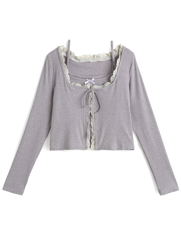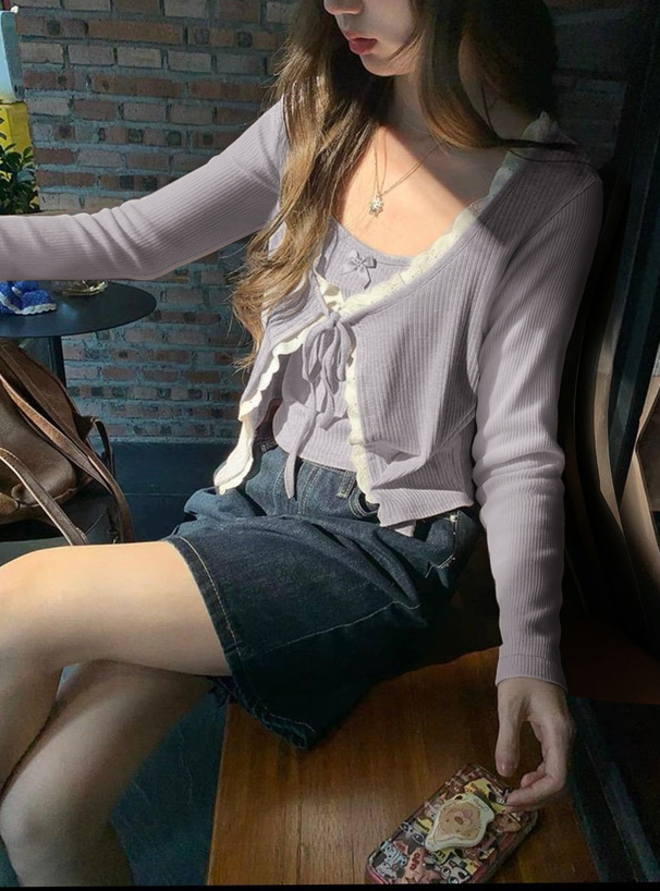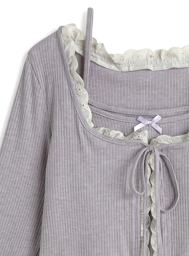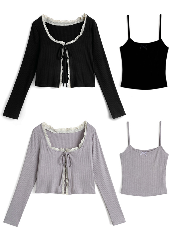 フロントリボンとレース使いがアクセントになった、カーディガンとキャミソールのアンサンブル。