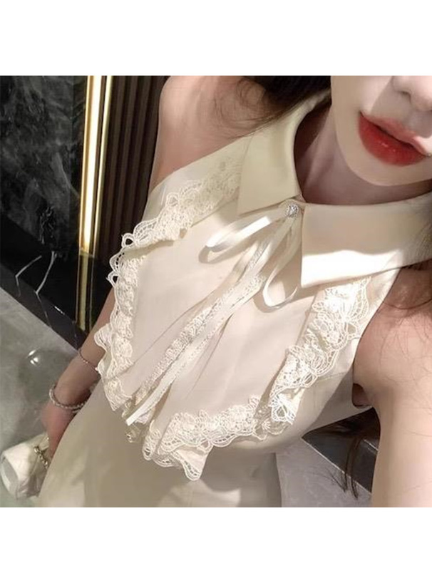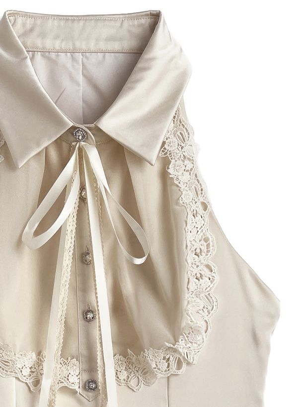 フロントには繊細なレースやリボンタイ、ビジューボタンをあしらい顔まわりを華やかに演出。