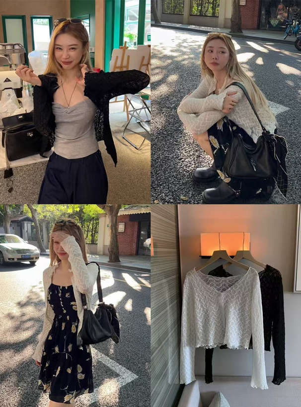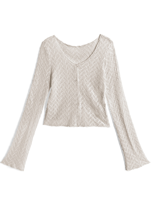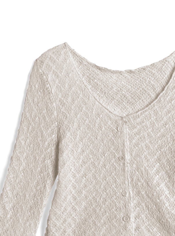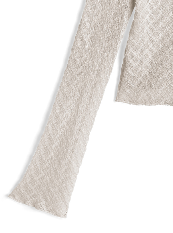 繊細な透かし編み調の素材を用い、軽やかな着用感を叶える。