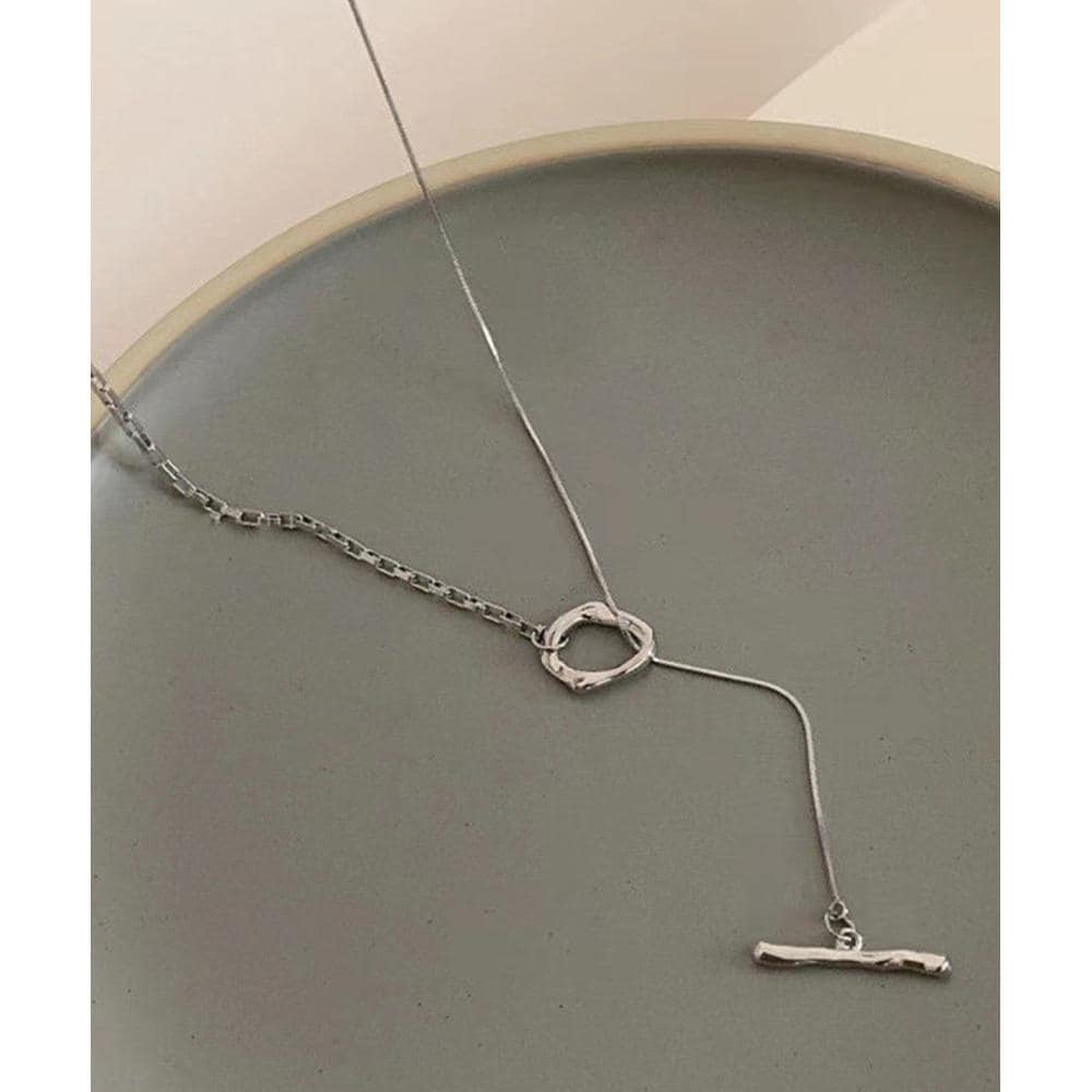 自由にモチーフを動かして好みのシルエットに調節ができるネックレス。シンプルながら存在感を放つデザインで首元のアクセントに。ユニセックスで使用可能。※シルバー系その他はマンテル部分の先端Tバーが直線。丸輪っかの形もシルバーとは多少差異あり。