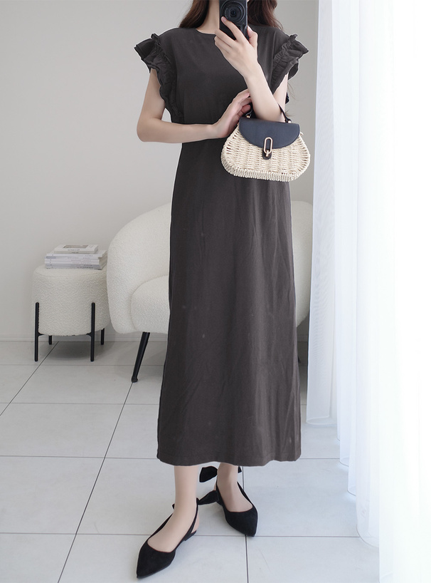 袖フリルロングワンピース/FREE/リネン/ブラウン/YR1621-181SM