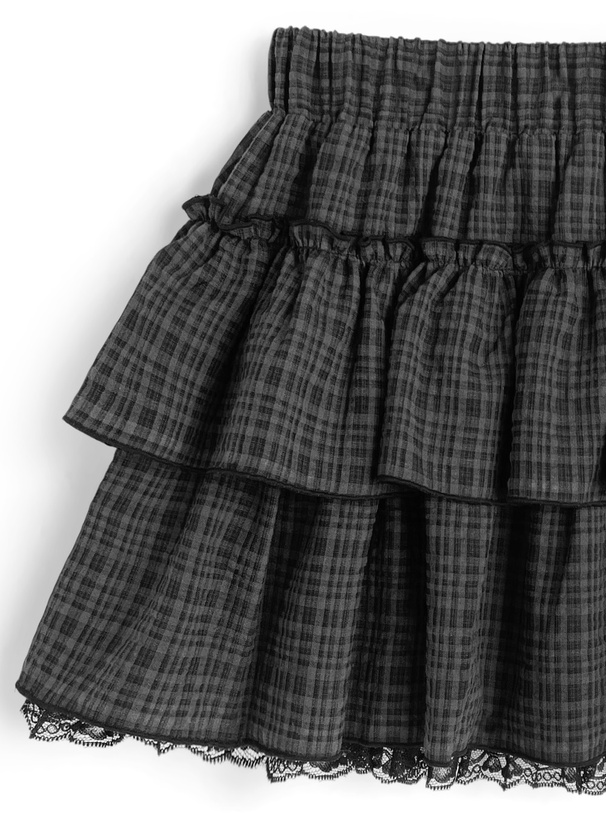 シックで落ち着きのあるチェック生地を使用した、甘すぎない印象のティアードフリルスカート。