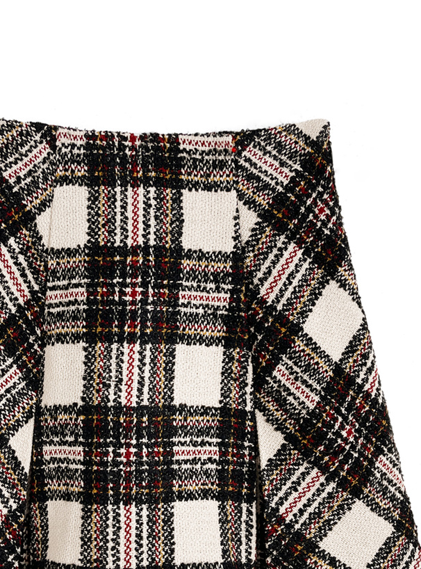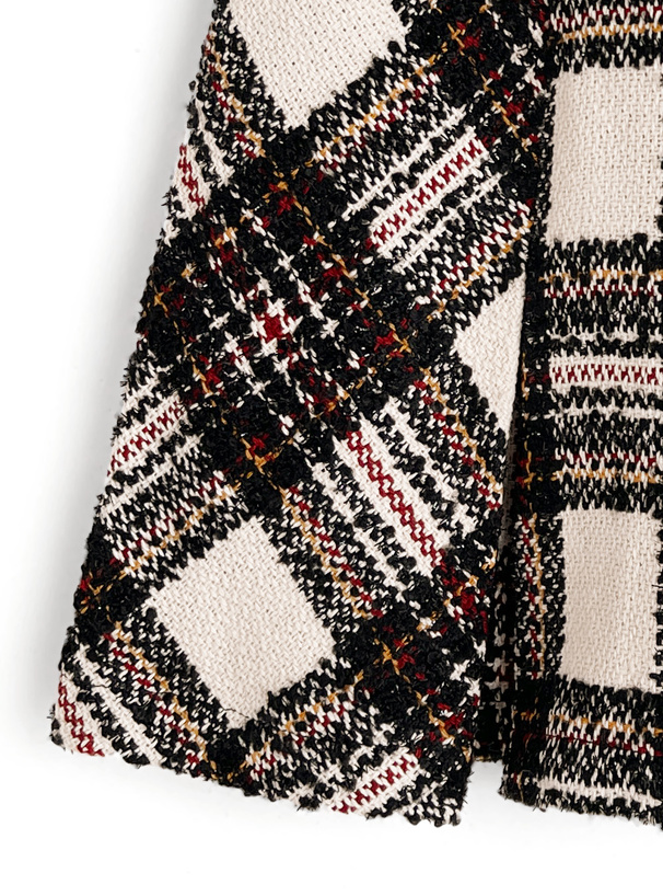 ラメ糸がほんのり煌めくツイード調のチェック柄生地が、クラシカルムードを発揮。