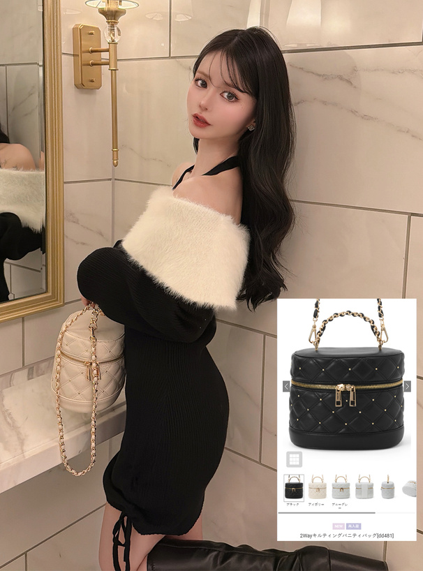 キルティングデザインにゴールドスタッズをあしらったバニティバッグ。
