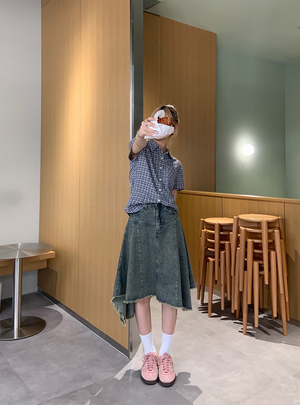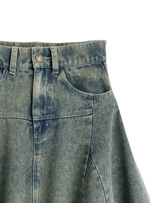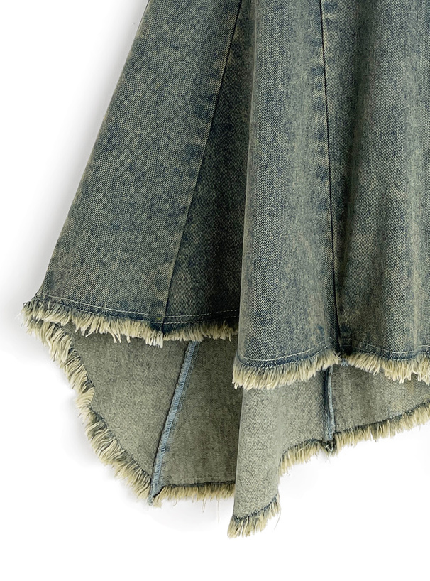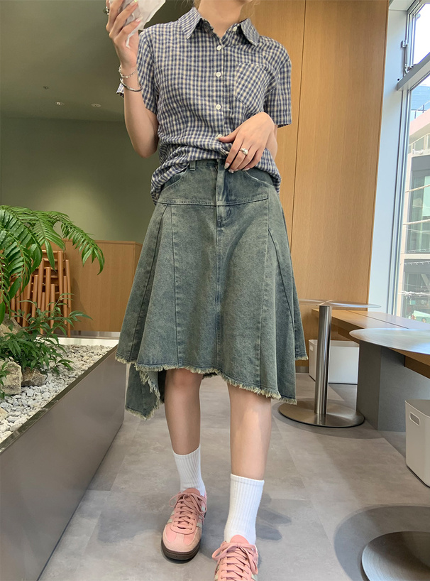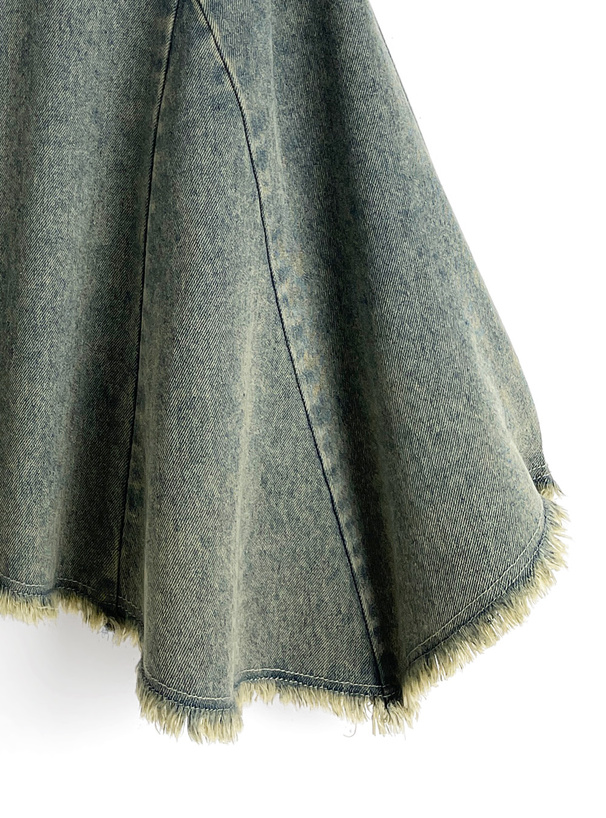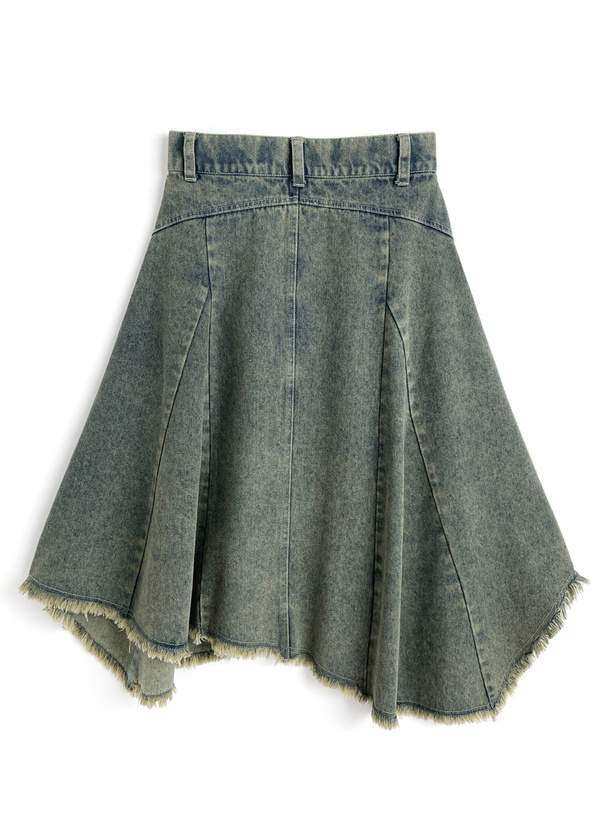 アシンメトリーなヘムがエッジの効いたスタイリングにぴったりのデニムスカート。