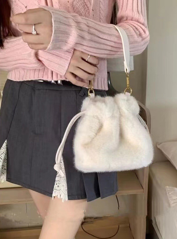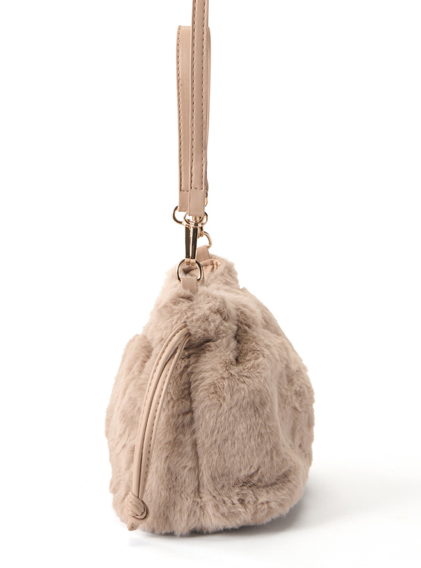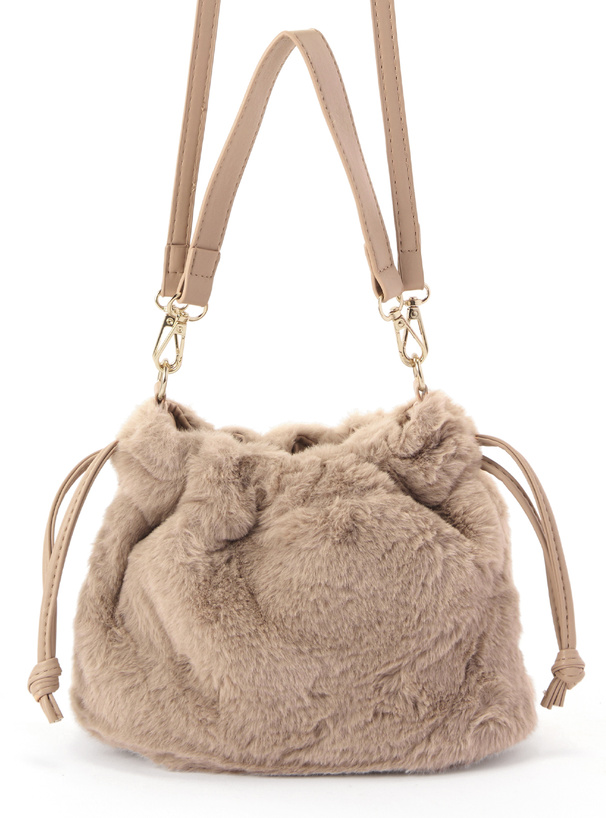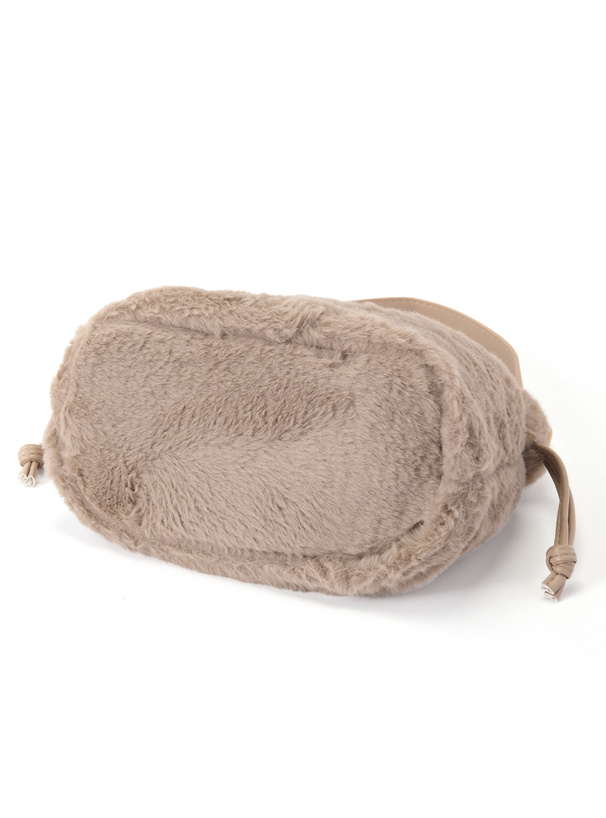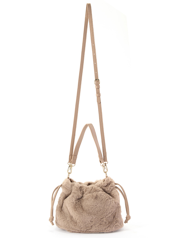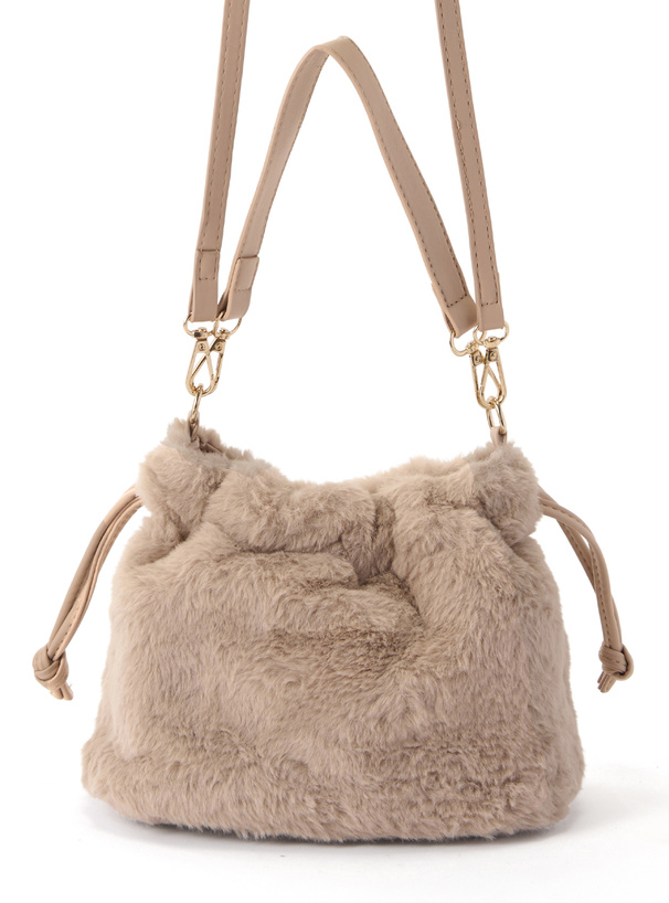 思わず触りたくなる、ふわふわのエコファーを使用した巾着バッグ。