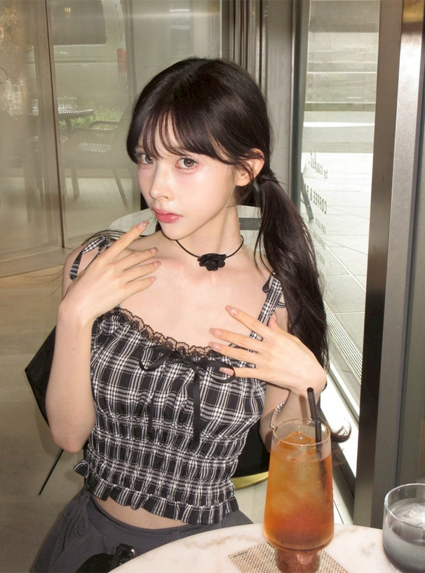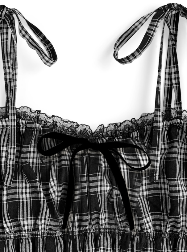 肩のリボンストラップがアクセントになり、甘さを引き立てる。