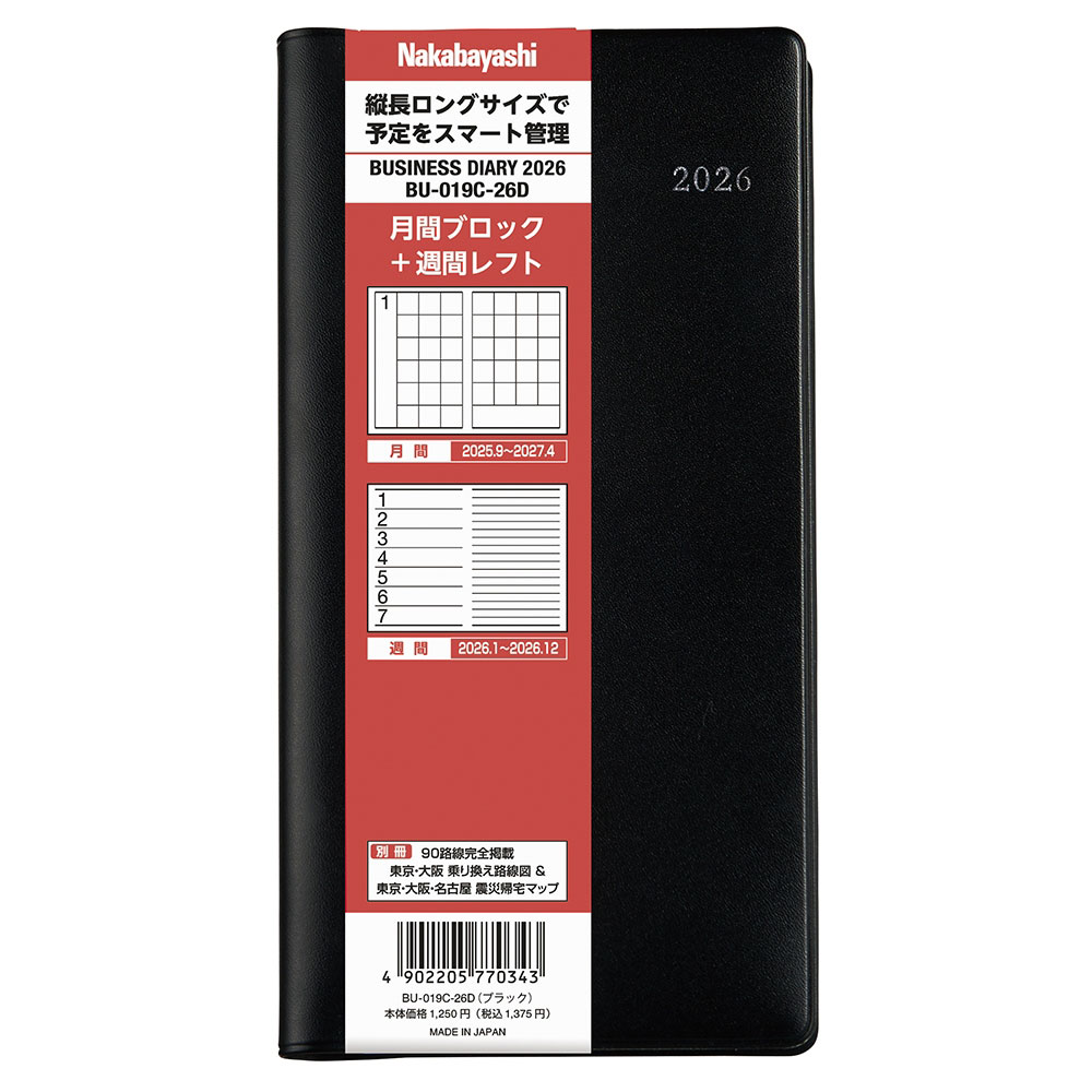 ビジネスユースに最適な、ベーシックなデザインの手帳です。熱心な愛用者も多い使って良さのわかる縦長ロングサイズ●表紙素材:PVCレザー●製本・仕様:糸綴じ製本・差し込み式●本体サイズ:ヨコ90×タテ175×厚み14mm●本体重量:131g●本文サイズ:ヨコ85×タテ169mm●日付期間(掲載期間):月間ブロック2025年9月〜2027年4月/週間レフト2026年1月〜2026年12月●罫内容:ブロックタイプ/週間レフト●記入欄:月間予定ブロック式/週間レフト+横罫●サイズ(判型):90mm*175mm●寸法:幅90×高さ175×厚み14mm●色:ブラック●表紙:PVCレザー●中紙:手帳用紙(白)●ページ数:192ページ(しおり2本付)