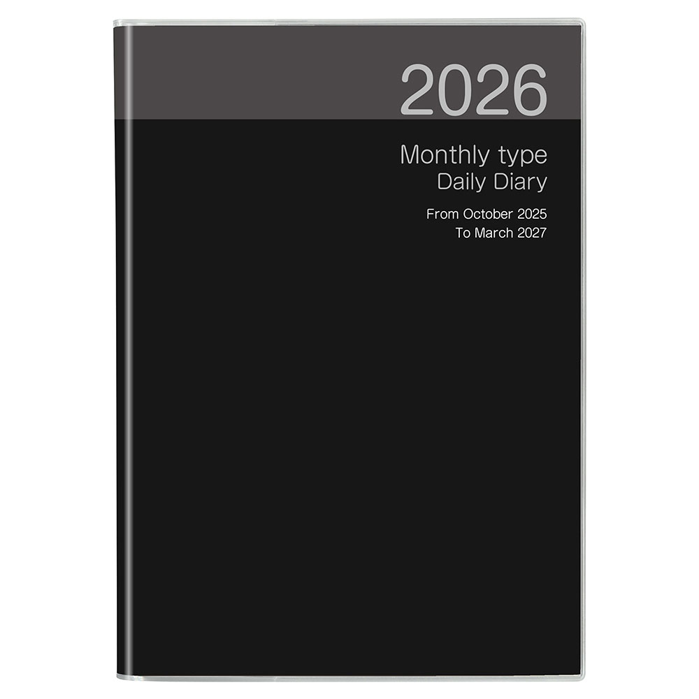 ご家庭やデスクでの活用範囲が広い大きめダイアリー。カレンダーとリンクさせるのに便利な日曜始まりタイプ。●表紙素材:透明PVCシート●製本・仕様:中綴じステッチャー止め製本・差し込み式●本体サイズ:ヨコ182×タテ257×厚み5mm●本体重量:240g●本文サイズ:ヨコ179×タテ252mm●本文:上質紙・64ページ●日付期間(掲載期間):2025年10月〜2027年3月●罫内容:ブロックタイプ●記入欄:月間予定ブロック式●サイズ(判型):セミB5●寸法:幅182×高さ257×厚み5mm●色:ブラック●表紙:透明PVCシート●中紙:上質紙●ページ数:64ページ