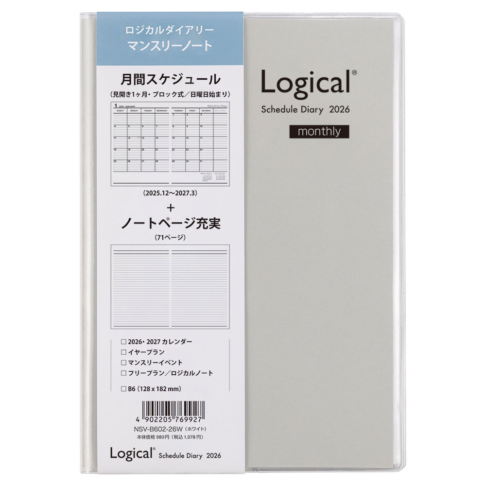 カラーPVCカバー付きB6サイズのロジカルダイアリー。ノートページがたっぷりのマンスリーです。月間スケジュール(見開き1 ヶ月・ブロック式/日曜日始まり)+ノートページ充実(71ページ)●表紙素材:透明PVCシート●製本・仕様:糸かがり綴じ製本・差し込み式●本体サイズ:ヨコ134×タテ188×厚み8mm●本体重量:165g●本文サイズ:ヨコ128×タテ182mm●本文:上質紙・112ページ(しおり紐1本付)●日付期間(掲載期間):2025年12月〜2027年3月●罫内容:ブロックタイプ●記入欄:月間予定ブロック式●サイズ(判型):B6●寸法:幅134×高さ188×厚み8mm●色:ホワイト●表紙:PVCシート●中紙:上質紙●ページ数:112ページ(しおり紐1本付)