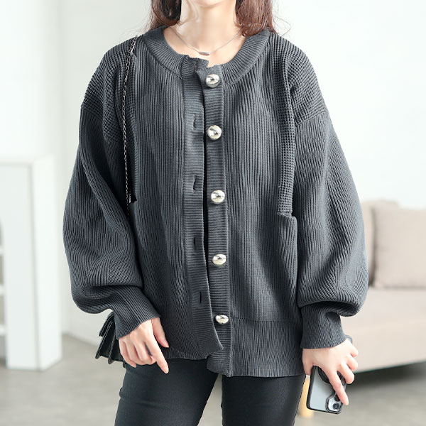ふんわりボリューム袖が魅力のニットカーディガンです。シンプルながらも上品なビックボタンがアクセント。ゆとりあるオーバーシルエットが体型をカバーして、リラクシーな着心地。袖や後ろ裾はスリット入りで、抜け感を作りながらも全体を引き締めてくれます。畦編み特有の立体感とふんわり感がシンプルなカーデに主役の表情に。縦&横方向にもぐーんと伸びるストレッチ性で身体に優しくフィット。視覚的にも縦ラインを作るのですっきりとした細見せができます。ちょっと肌寒い日のアウターにもぴったり。上品カジュアルを楽しんでみてください。