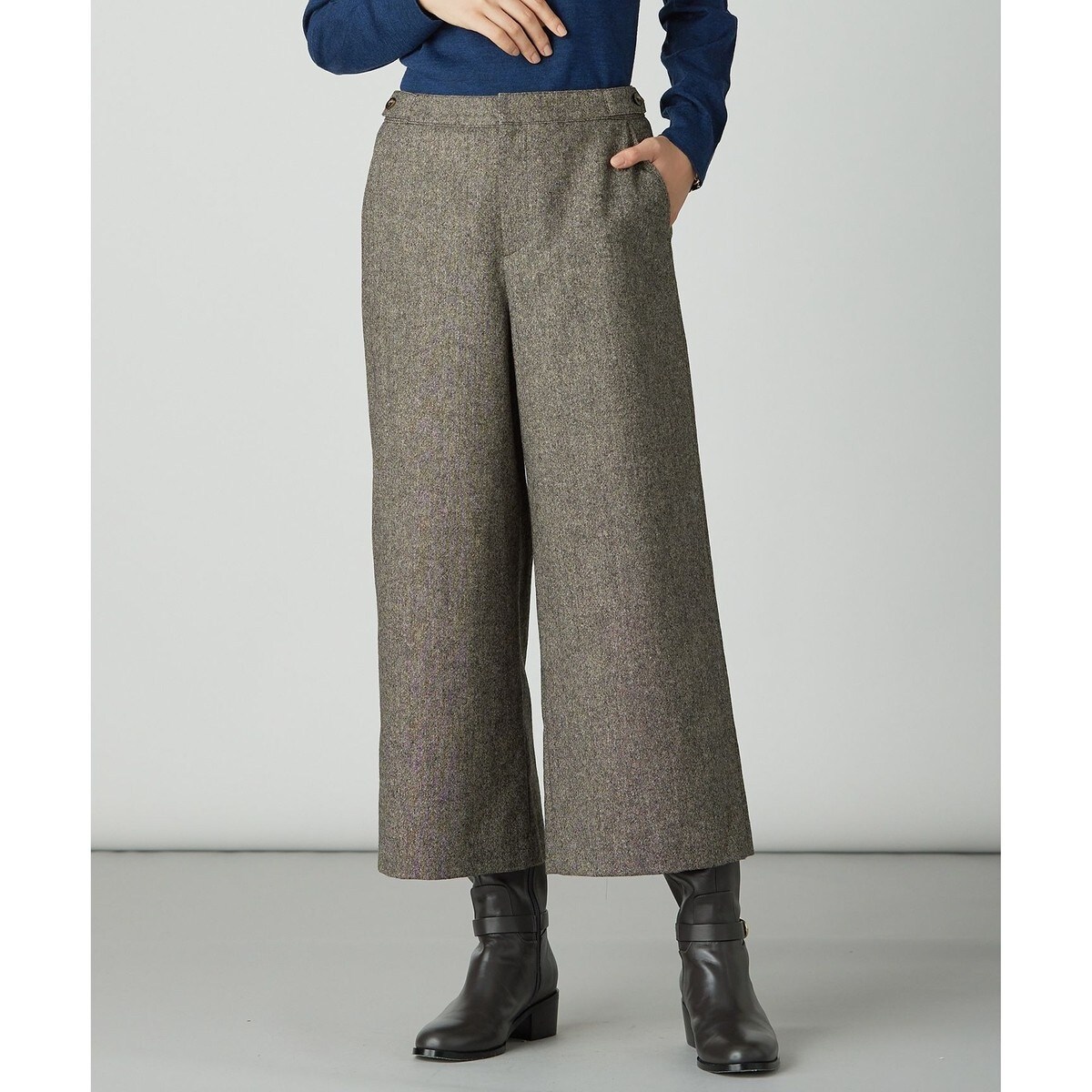 ■デザイン軽やかな穿き心地のワイドストレートシルエットのクロップドパンツ。裾に向かって広がり過ぎないすっきりとしたラインで、パンプスからショートブーツまでバランスよく合わせられる、ボリューム感と丈感に仕上げました。ウエスト脇には釦で調節可能なタブを付け、見た目だけでなく穿き心地にもこだわりました。気温が下がりきらない時期から季節感を先取りできる、アイテムに仕上げました。総裏ありです。
