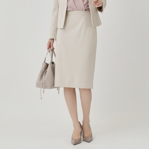 定番のタイトスカートで、脇線を前に移動したデザインなので細見え効果と脇跳ねがしにくいシルエットに拘りました。