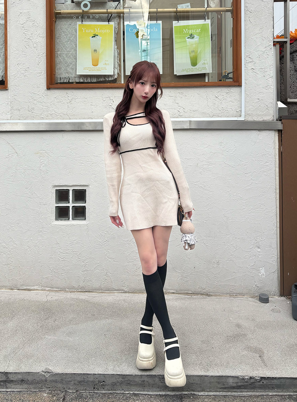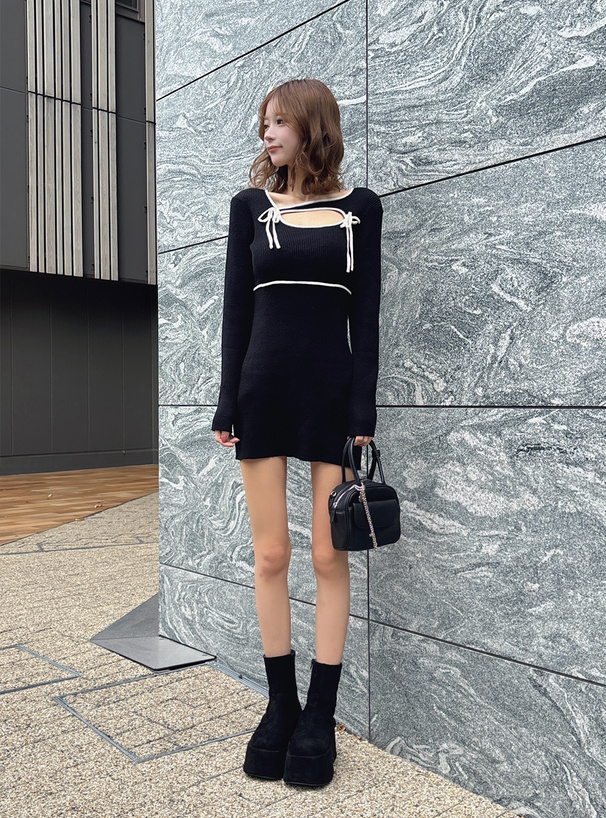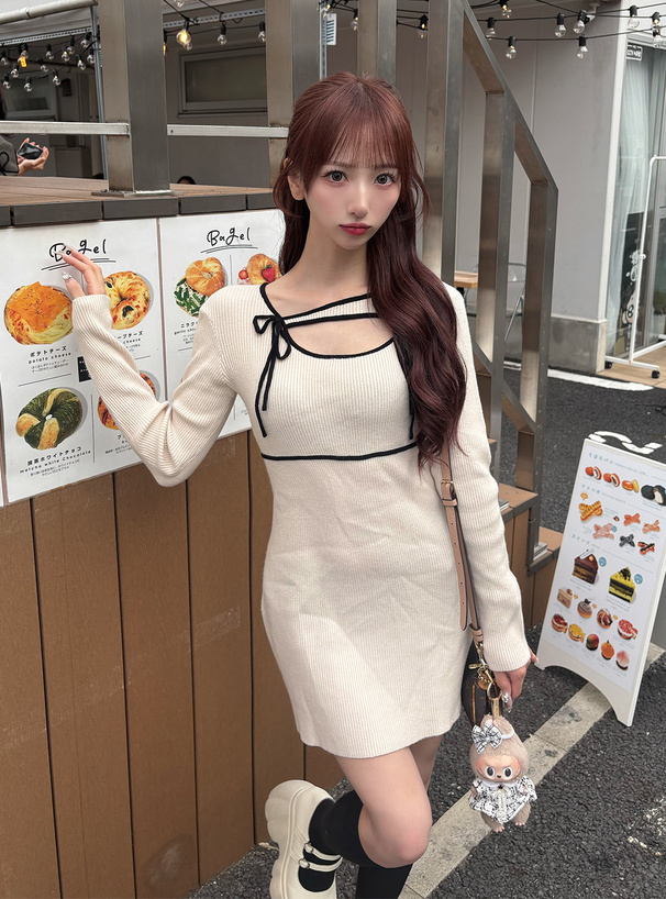 チェック柄フロントオープンリボンニットミニワンピース[ru1372]